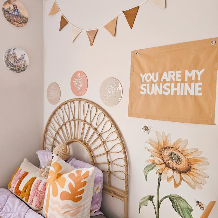 Add a burst of joy to your little one’s space with the You Are My Sunshine wall banner — a sweet and uplifting nursery wall banner perfect for sunshine to any bedroom. Designed as a gender neutral decor piece, this lightweight You Are My Sunshine wall hanging is easy to display and ideal for kids rental friendly decor.